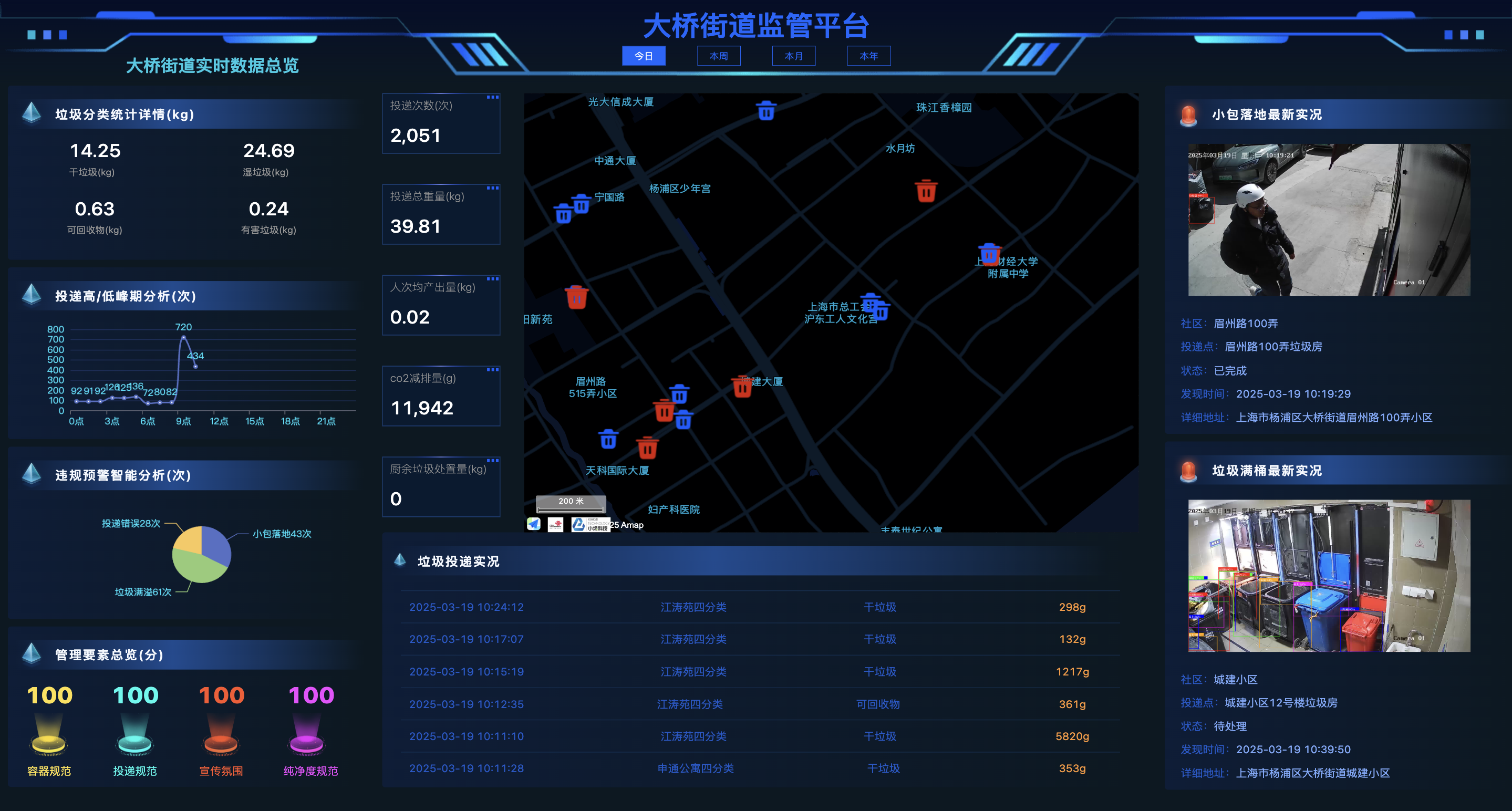 通过智能化垃圾分类设备覆盖,收集垃圾分类数据,形成发现-通知-处理-销项闭环处理模式,提高工作效率。